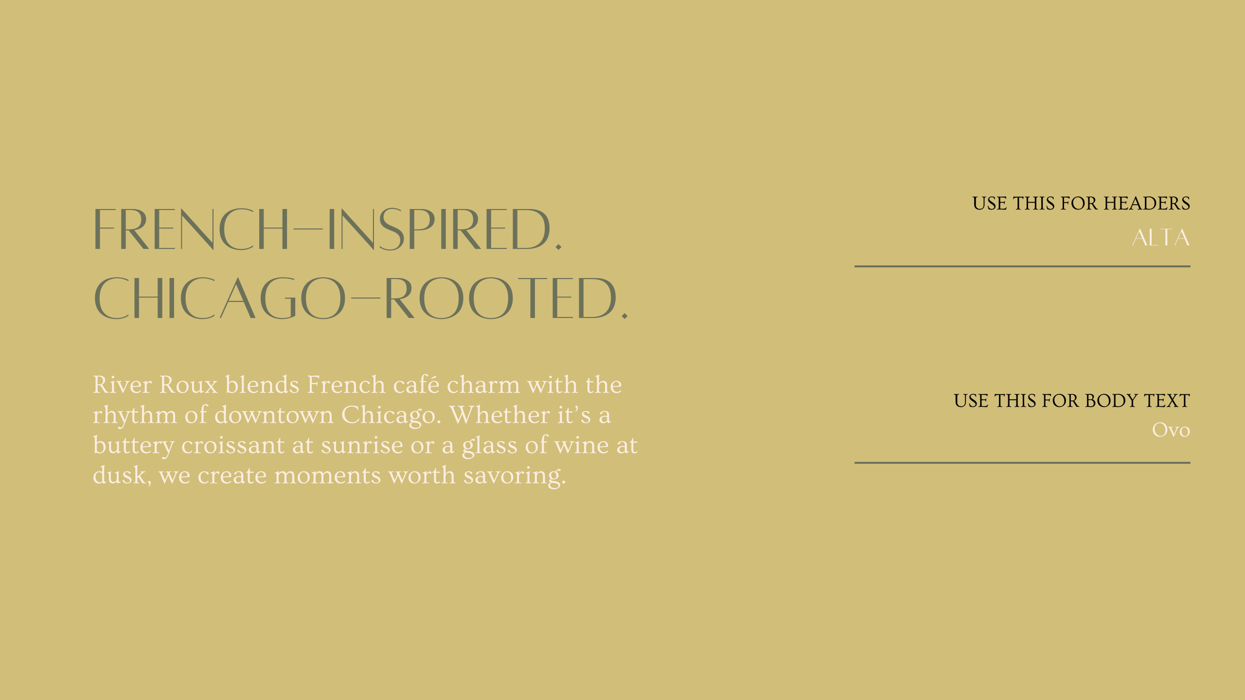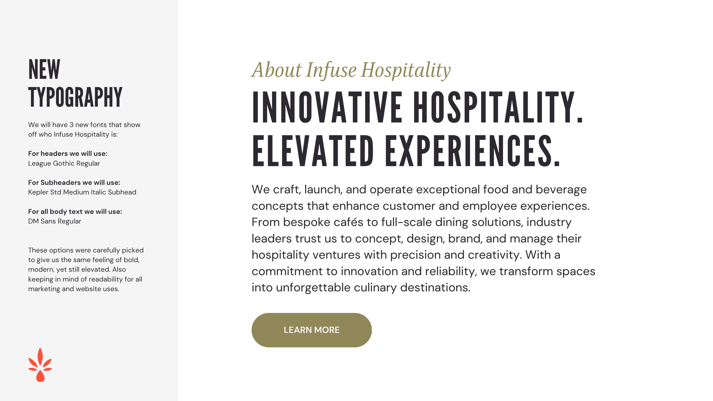 This client project, completed through Infuse Hospitality, began with collaborative name ideation alongside the team and client, followed by developing a cohesive color palette, fonts, and logo.